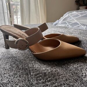 Chic and versatile beige pumps by Anne Klein. Chic strap with gold detailing. Ideal for elevating any outfit. Brand new never worn.