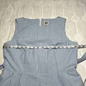 Channel timeless East Coast summer chic with this Anne Klein sleeveless striped dress in a classic blue-and-white seersucker-inspired pattern. Crafted from a lightweight cotton blend, it features a flattering A-line silhouette, belted waist tie for adjustable shaping, two convenient pockets, and a knee-length cut that’s perfect for warm-weather occasions. The boat neckline and crisp tailoring add a refined touch, making it a versatile piece for both casual and semi-formal outings.