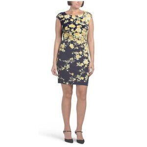 Anne Klein Womens Blue Yellow Floral Boat Neck Side Pleat Sheath Dress Sz 10 NWT