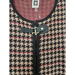Classic Anne Klein Camel, Black & Touch of Red Houndstooth Sweater Jacket w/Faux Leather Snap Clasp Size Med