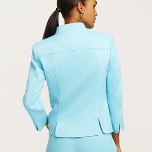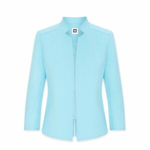 Add classic style to any outfit from white jeans to tailored skirt with this beautiful tailored and versatile jacket in deep robin’s egg blue. Easy going yet crisp with an open front, stand collar, princess seams, and split cuffs. Fully lined in the same color blue with silver trim accent. Jacket is 98% Polyester, 2% Elastane. Lining is polyester. 3/4 sleeves. Approximately 22-24” from shoulder to hem. Dry Clean.