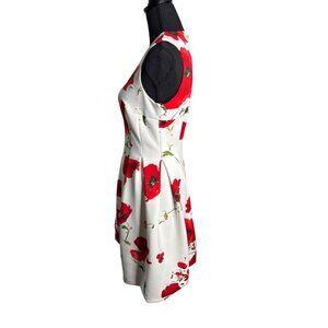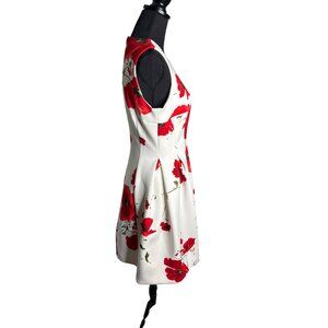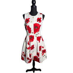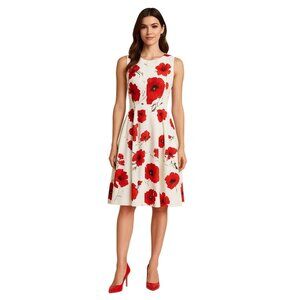 Elegant and timeless, this Anne Klein sleeveless dress is perfect for weddings, garden parties, or cocktail evenings. The bold red poppy floral print on a crisp white background creates a striking contrast, while the fit and flare silhouette flatters the figure beautifully.