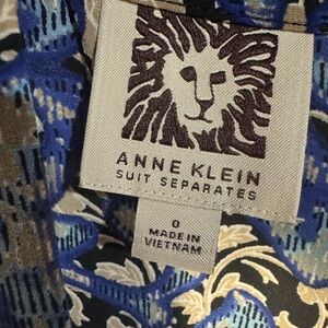 Anne Klein Chic sleeveless blouse with intricate blue and cream design. Perfect for versatile styling.
