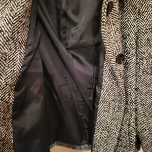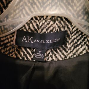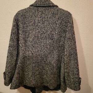 The product is a stylish Anne Klein women's herringbone peacoat. This XL size jacket features a single-breasted design, making it a versatile and fashionable choice for everyday wear. The herringbone pattern adds a touch of sophistication, while the high-quality material ensures durability and comfort in this must-have coat for any woman's wardrobe.