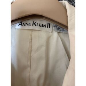 This Anne Klein jacket is a classic piece crafted from luxurious silk, featuring a solid ivory color and a mid-length design. It is tailored for women in a size 10 with a regular fit and long sleeves. The jacket is fully lined with silk, offering a vintage appeal suitable for formal occasions. Made in Hong Kong, it requires dry cleaning. The jacket is pre-owned.