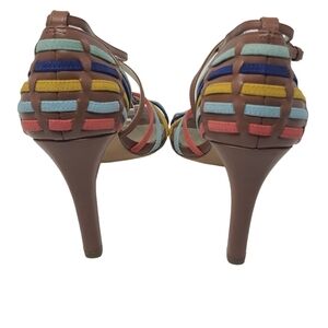 Women's multi-colored strap, open toed, ankle strapped heels by Anne Klein, size 11M. Gold buckle hardware. Heels measure at 4". Please see close-up pictures for more details. The original box is not included.