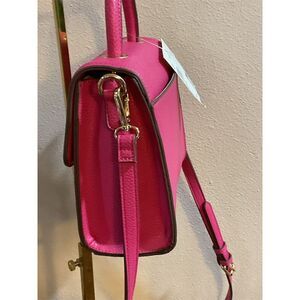 Anne Klein's Top Handle Crossbody Satchel in pink textured faux leather is the epitome of fashion and elegance. This medium-sized bag features a solid pattern with gold-tone chain accents and logo details, making it a standout accessory for any casual occasion. The multicolor lining adds a playful touch, while the adjustable and detachable strap offers versatile styling options. With multiple pockets and a magnetic snap closure, this bag is as functional as it is stylish. Dimensions: 10" height, 5" depth, New with tags (NWT).