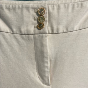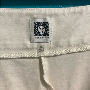 Light tan soft stretch pants by Anne Klein. These pants are straight leg with a zipper and three gold lion button closures. In good condition, no visible flaws. Great for the office, easy to wear. 68% viscose, 28% nylon, 4% elastane. Made in Vietnam. Women's size 10.