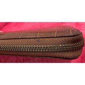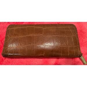 Classic and stylish Anne Klein zip around wallet in a rich brown croc embossed faux leather finish. Features gold-tone zipper hardware with “Anne Klein” logo, spacious interior with