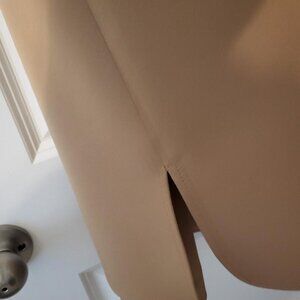 Anne Kelin's beautiful duster topper is lined with gold metallic trimming inside. No pockets. Has accent botton slit on each side. The sheath dress is lined, round collar, with a zipper enclosure.This set will give you the sophisticated look of glamour and distinction you deserve. Color: Camel; Matieral: 92% Polyester, 8% Elastane.
