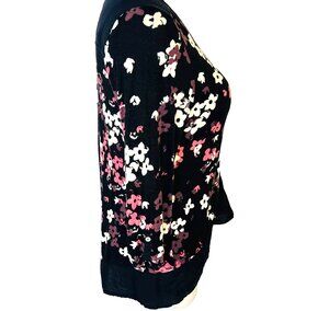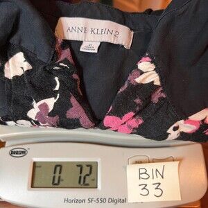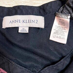 The Anne Klein Women's XL Tunic in Floral Print with 3/4 Roll Tab Sleeves and a V-neckline is a stylish and versatile piece perfect for various occasions. Made from a comfortable knit fabric blend of spandex and rayon, this pullover blouse features a relaxed fit and stretch for added comfort. The colorful floral pattern in black, pink, white, and purple adds a fun and feminine touch, while the henley V-neck accent gives it a trendy twist. Machine washable for easy care, this tunic is a must-have for any woman's wardrobe, suitable for all seasons. Measurements: 23" armpit to armpit and 28" length. Please verify these are larger than your own to ensure it fits. Dress form is a size 18 with a 45" bust. Note: This sale is final unless product does not match the listing. Condition: pre-owned - good. Some fabric fade in places.