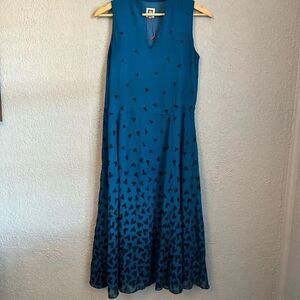 This is a cute midi dress with a lining, has a lovely print. It does not have the fabric to the belt. Please see pictures.