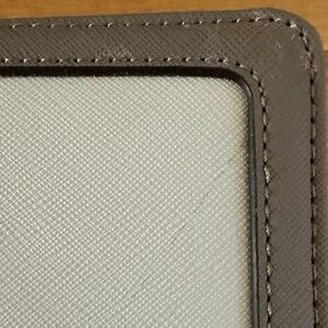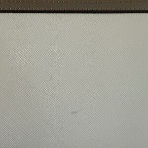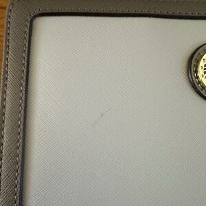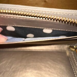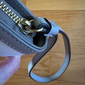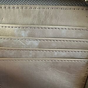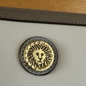 Anne Klein Wristlet Cream Taupe. Cream color with taupe/gray trim. Gold tone Anne Klein sunburst medallion attached to front. Wristlet strap attached to zipper. Three quarter zip opening into a wallet with 6 card slots and a long slip pocket behind the card slots. Opposite side of card slots is a zippered pocket for coins or small items. Pull the coin purse forward to find a roomy area for currency and receipts. Nice wallet tucked inside this pretty wristlet. Very good condition; with some minor cosmetic spots. Slight discoloration to some places in the interior (pics 7-8.) Two light, small marks on back exterior (pic11.) Two light marks on front exterior; one on the top right corner (pic 12) and one on the left side (last pic.)
