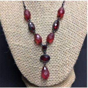 Anne Klein Y Drop Necklace Raspberry Red Black Faceted Gunmetal Silver Retro
