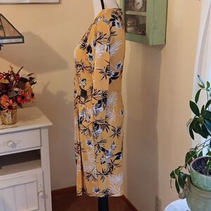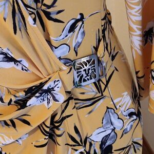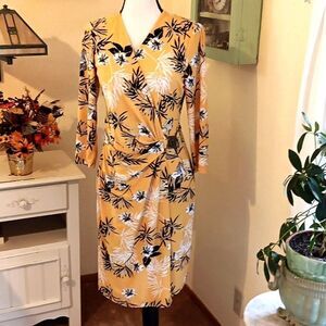 This pretty dress is unique and fun. The bright mustard color is embellished with an exotic floral design. Wrap front drawn to the left side with a pretty silvertone buckle. Faux wrap skirt. Bracelet length sleeves. Size 8 measures 40 at chest, 30 at waist, 40 at hips, 39 long from shoulder to hem. I love this color all year round. Add a blazer for work. It's a beauty.