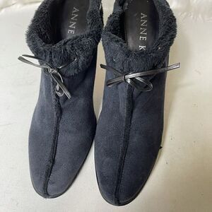 Anne Klein black suede mules with faux fur contour leather lace size 10. Pre owned in good used condition no tear see all pictures any questions please message.