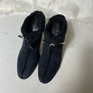 Anne Klein black suede mules with faux fur contour leather lace size 10