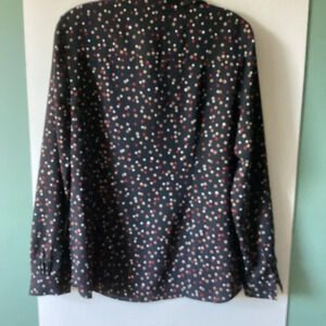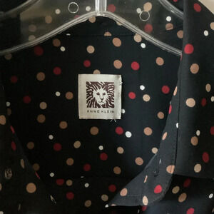 Black blouse with tan, red, white polkadots. Buttons down the front button cuffs. Polyester Hand wash or dry clean. It did not have a size tag but my best guess is a small.