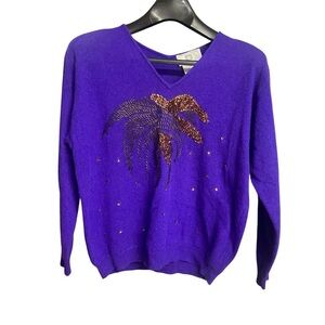 Vintage 80s Sweater. This sweater has a V-neck design. It is 70% lambswool 20% angora and rabbit hair 10% nylon. It is a vibrant purple with a gold beaded palm tree on the front.