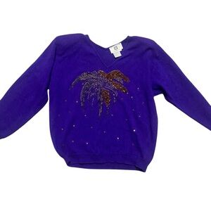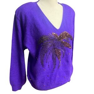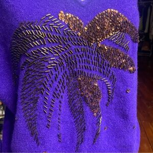Vintage 80s Sweater. This sweater has a V-neck design. It is 70% lambswool 20% angora and rabbit hair 10% nylon. It is a vibrant purple with a gold beaded palm tree on the front.