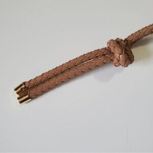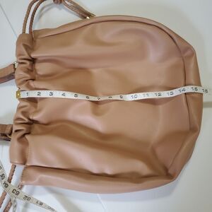 The drawstring bucket bag tote from Anne Klein has braided tassel straps that cinch the top opening for secure carrying. Closes with a snap. Neutral beige taupe color with the slightest hint of warm pink or peach undertones. Top handles with 10" drop, 3 Interior Pockets: 1 zip, 2 slip; vegan PVC leather with fabric lining. Approximately 15" L x 3" W x 15" H can hold a lot of items. Perfect summer work bag. In excellent condition from my smoke free home. I only carried this purse one time.
