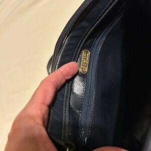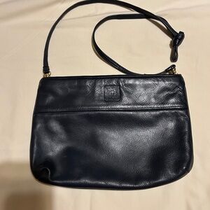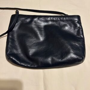Purse is sleek soft leather. Color is Navy blue. Has one shoulder strap and has zip closure. 1 inside pocket. Great condition. You can take the strap off to make it a clutch purse. 12 inches across x 8 inches long.