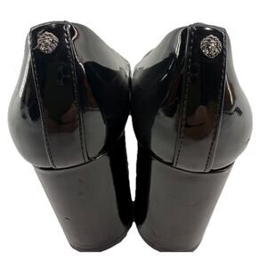 Anne Klein iFlex patent leather heels. Style AK Megan, featuring a comfortable block heel and signature lion-head emblem on the back. Classic black high-shine patent with a peep-toe design.