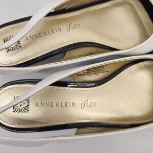 Elegant and comfortable, these Anne Klein iFlex slingback heels feature a stylish white and black leather design with crystal embellishments. Size 9M.
