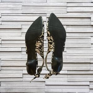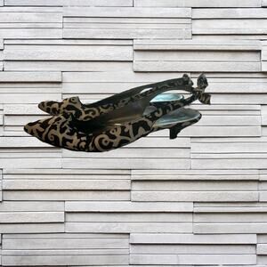 Eye catching black & white fabric kitten heels. Cute tie at back of heel. I always receive compliments on these! Excellent smoke free condition.