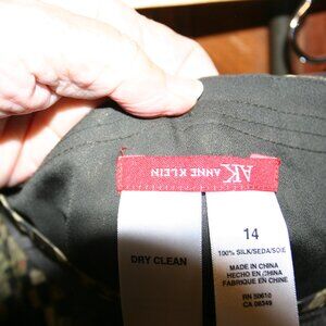 Anne Klein gored silk skirt, fully lined, in olive green, black, and taupe. High-quality 100% silk with a slight sheen, not shiny or sparkly (that is the camera flash). Side zipper, olive green ribbon at waist which measures 36", 27" long. Size 14.