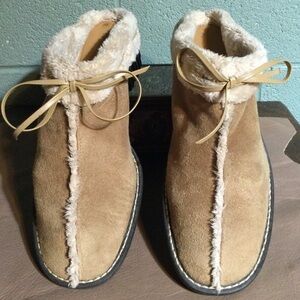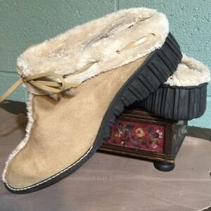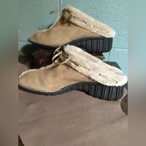 Anne Klein n.y. NWOT slip ons warm fur lined mules size 8. These shoes have never been worn and are in perfect condition… no flaws they slip on and are lined with warm soft fur. They are tan in color and are a stretchy suede fabric. With cute leather laces on top