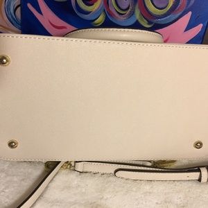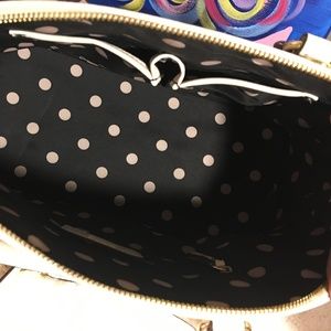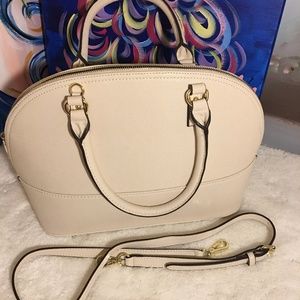 This chic purse has a detachable, adjustable strap to transform this shoulder purse into the image of a crossbody. There is a beautiful strong, structured shape with a sassy pattern on the inside with matching pockets and zipper on the inside. This purse has great storage space and is very clean with no worn or damage! Just let me know if you have nay questions or need any pictures.