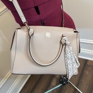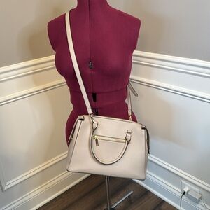 Two minor marks to the back of the purse as pictured. These are not very noticeable. A tan Anne Klein purse with a Crossbody strap and handles. Features gold hardware with scarf detailing around one of the handles.
