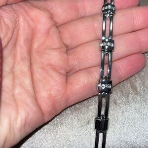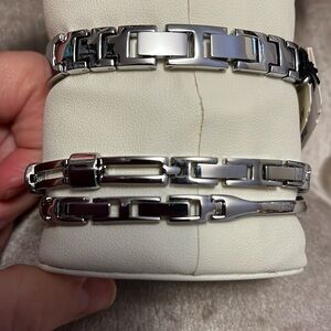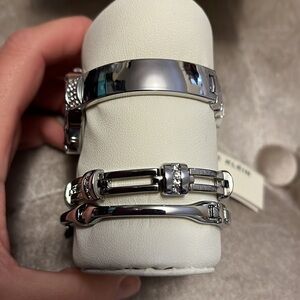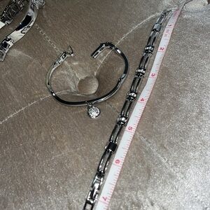 Brand new in original box this is a gorgeous Anne Klein watch and bracelet set. There are three pieces, first being the watch that has several links that can be removed so it will fit most wrists. I have a very small wrist and if I remove all the links it will fit me but right now it’s quite large for me, see photo that includes the measurements of the one bracelet, that is exactly the size that the watch is. The one bracelet has silver links and then crystals in between the links and the other bracelet is more of a bangle style with a crystal charm hanging off of it. Both bracelets are also adjustable. This is a beautiful gift for someone else or for yourself. Timeless design, will never be out of style.