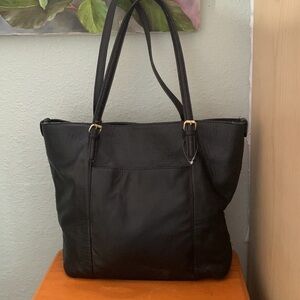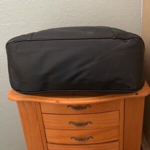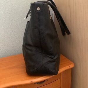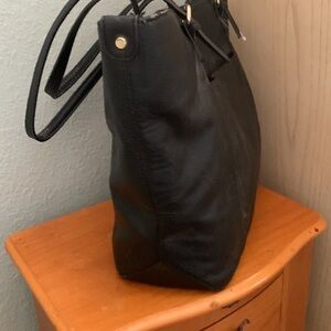 Beautiful Anne Kline bag gold tone, hardware accented, with one outside slip pocket on back,duel, adjustable handle shoulder straps. And Crossbody strap ,One zip pocket inside and two slip pocket has been lovingly. Used corners are in good condition, and, is made with all man-made material.