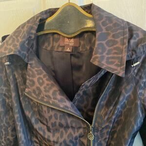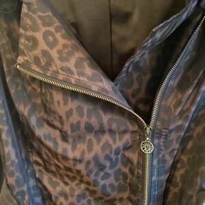 Lovely belted animal print rain coat. Zips on the side. Hooded. Pocket with zipper on front shoulder. Fully lined. Armpit to armpit measures 19 inches. 33 inches long. Excellent condition.