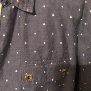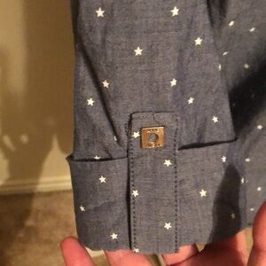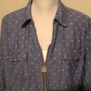Anne Klein jacket with gold zipper and buttons. Roll up tab sleeves. Yoke back with quality flat feld seams. Color is denim blue with small white stars. Fabric is lightweight for warmer weather . Excellent condition. Absolutely no wear, tears, stains . Extra large