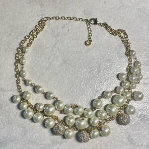 Double strand faux pearl with 3 rhinestone covered beads on gold tone chain. Signature tag