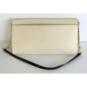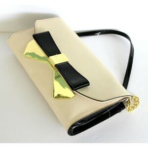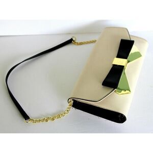 Anne Klein IVORY COATED GENUINE LEATHER BLACK GOLD BOW FLAP SHOULDER BAG CLUTCH