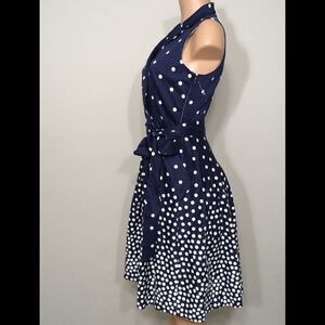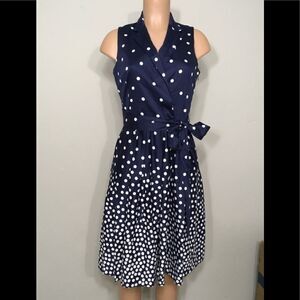 This sleeveless polka dot aux wrap dress is perfect for a feminine professional look. Fit: this style fits true to size. - Surplice neck with notch lapel - Sleeveless - Side seam zip closure - Allover print - Approx. 40" length Imported