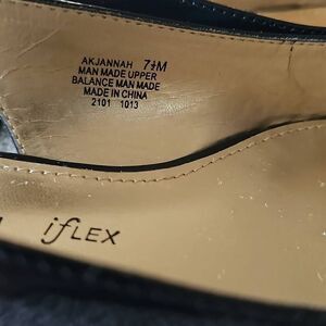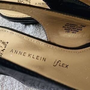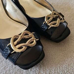 Anne Klien Black Sling Back 2" heel Patten Leather Gold Hardware accents.