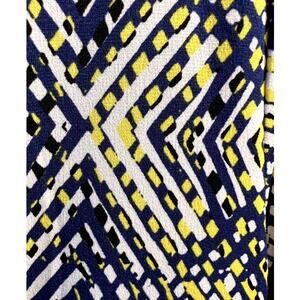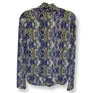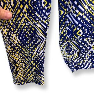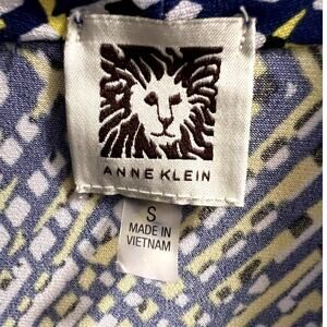 Details: Fun, Geometric pattern Anne Klein blouse. Layered look over same material tank and gathered at the bottom with a waist band. Long sleeves, stretchy material, very comfortable. Wear under a jacket, coat or by itself. Work, Career, Professional core, Dark Academia, Dressy.