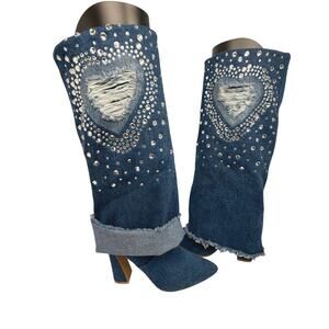 Anne Michelle Kenon tall boots, size 7.5 (New With Tags). These unique, eye-catching boots feature a blue denim upper with a striking rhinestone heart detail. Designed with a versatile fold-over shaft to wear high or cuffed. Perfect for adding a bold, playful statement to any outfit. Features a comfortable zip closure and sturdy heel. Unworn and ready to ship!