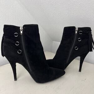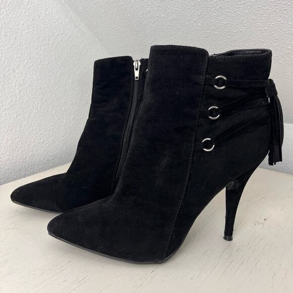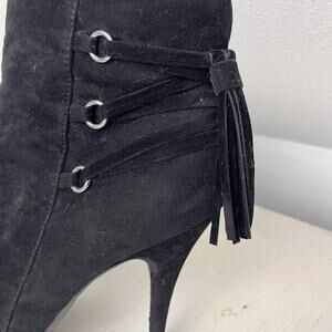 Black faux velvet boot with faux fur lining, very soft inside and out. Pointed toe. Approx 4” stiletto heel. Zip on inner side for easier on off. Corset style lace detail with tassel. Super cute boot for a night out on the town.