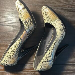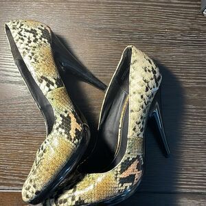 Step out in style with these Anne Michelle women's pumps. Featuring a chic snakeskin pattern in tan and black, a sleek pointed toe and a glossy black stiletto heel, these pumps are the perfect statement shoe for a night out or elevating any outfit.
