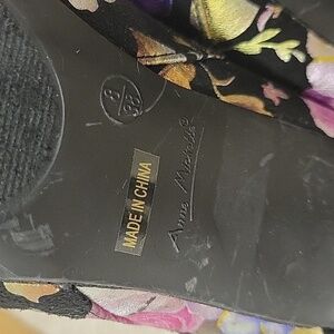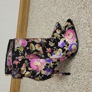 Anne Michelle black floral fabric heeled bootie Euro 38/ US sz 8. back zipper 4.5" heel