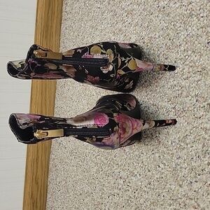 Anne Michelle black floral back zip heeled booties Euro sz 38/US 8. 4.5" heel