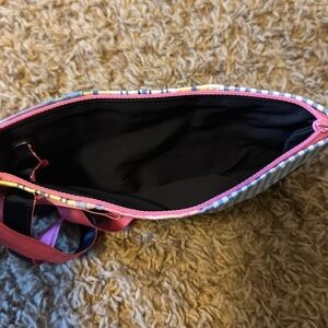 Stylish clutch featuring stripes and plaid with a pink ribbon accent. Perfect for casual outings.