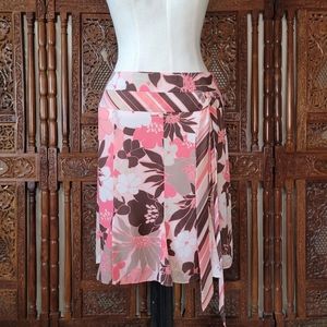 Adorable floaty tropical skirt in a very cohesive Y2K pink and brown colorway. Tie front detail and mini skater skirt shape with flouncy panels. Fully lined and in excellent preowned condition.