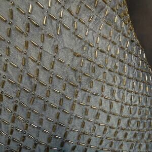 - Decoration: Hand-sewn gold-tone tubular beads